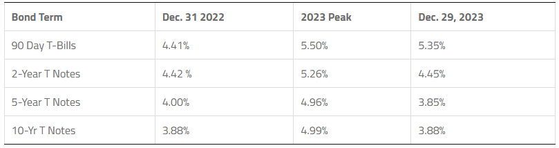 Bond TermDec. 31 20222023 PeakDec. 29, 202390 Day T-Bills4.41%5.50%5.35%2-Year T Notes4.42 %5.26%4.45%5-Year T Notes4.00%4.96%3.85%10-Yr T Notes3.88%4.99%3.88%