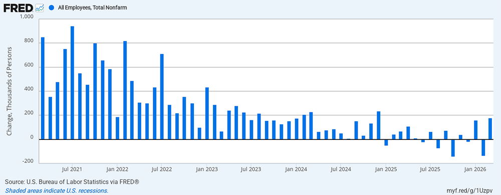 The US Economy was losing momentum before the first missiles struck Iran. Fourth quarter GDP was revised down to 0.5%, a sharp deceleration from 4.4% in the third quarter. Most concerning is the labor market, where the deterioration has been underappreciated. Five of the past ten months have showed net losses in payrolls. The Bureau of Labor Statistics’ annual benchmark revision cut total job growth in the entire year of 2025 to just 181,000, a number that a healthy labor market would produce in a single month. Long-term unemployment has risen +21.5% to 1.8 million, up from 1.5 million a year ago, while the labor force participation rate has dropped from 62.5% to 61.9%. An unemployment rate of 4.3% is not overly concerning but the trajectory of hiring is troublesome and deserves close attention. To increase our optimism on the US economy for the remainder of the year, we will need to see a turnaround in the labor market. An encouraging March report of 178,000 jobs gained suggests an improvement is underway.